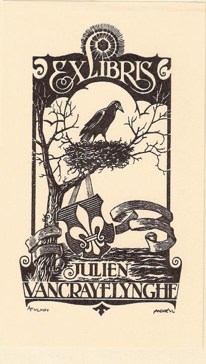 Op 18 januari 1919 wordt daar de Belgische ex-librisvereniging boven de doopvont gehouden, ABCDE (Association belge des Collectionneurs et Dessinateurs d’Ex-Libris) onder het voorzitterschap van Louis Titz, een begaafde graficus die overigens veel boekmerken heeft gegraveerd (afb. 1). ABCDE overleeft met ups en downs, geeft in 1956 een laatste kunstmap uit, om in 1975 haar archief over te dragen aan het IEC (Internationaal Ex-libris Centrum) dat in dat jaar werd opgericht.